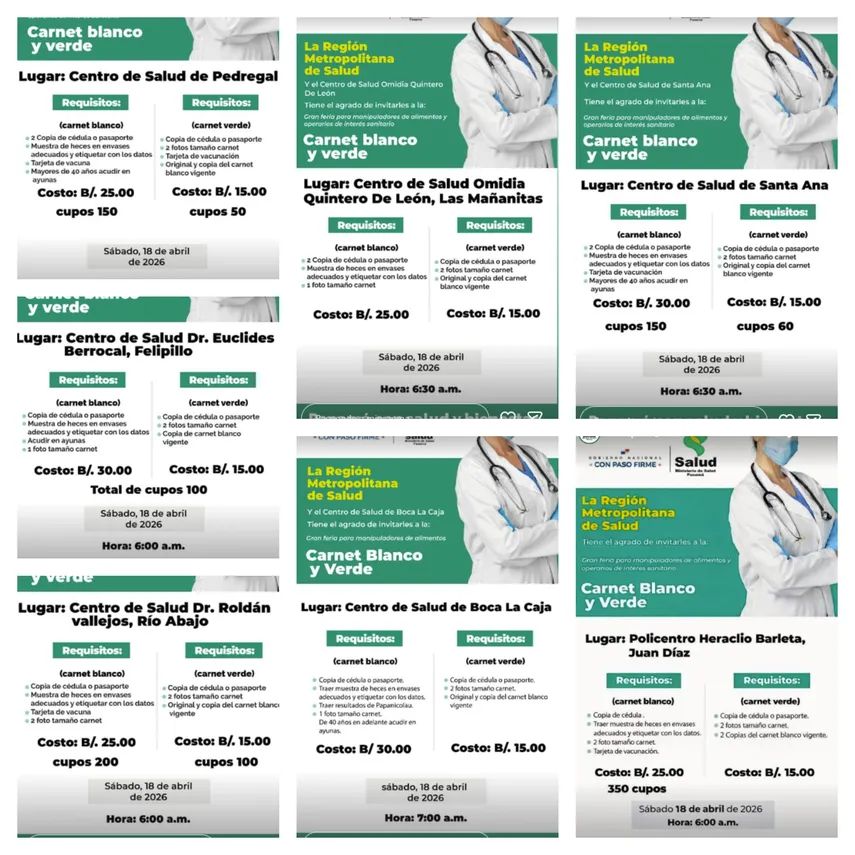 El Ministerio de Salud (MINSA), a través de la Región Metropolitana de Salud, anunció la realización de ferias para la obtención y renovación del carnet blanco y carnet verde este sábado 18 de abril de 2026 en distintos puntos de la ciudad.