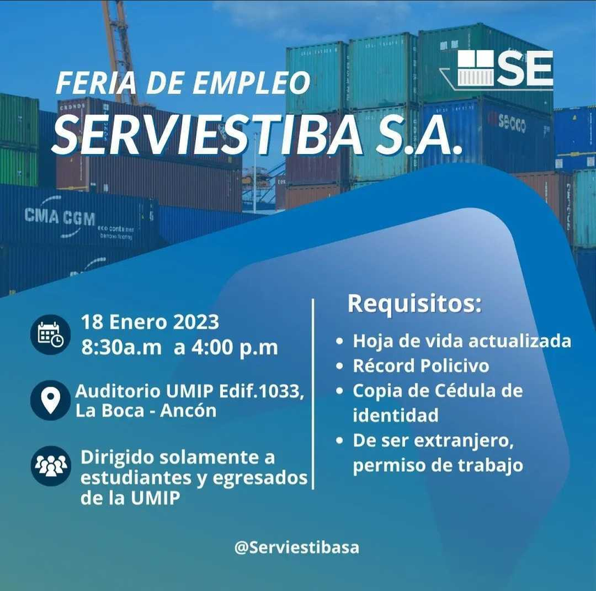 SERVIESTRIVA S.A. realizará este miércoles 18 de enero, la feria de empleo especializada en la contratación de personal que sea estudiante o egresado de la Universidad Marítima Internacional de Panamá (UMIP).