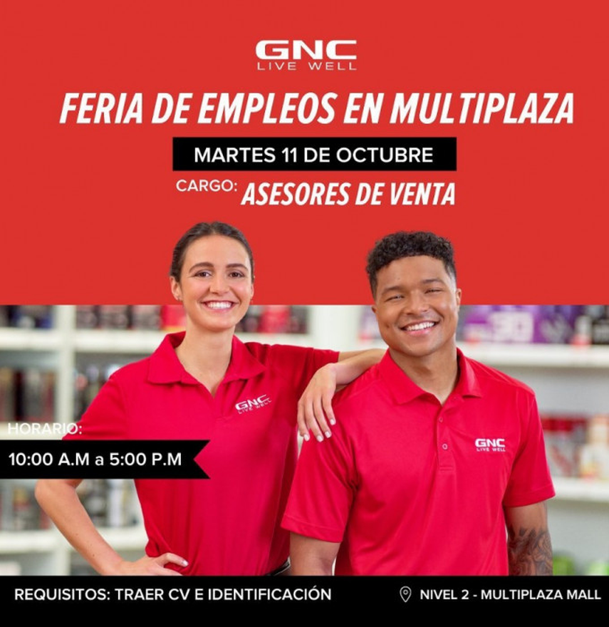 En el 2do nivel del Centro Comercial Multiplaza se realizará este martes 11 de octubre una feria de empleo en sus instalaciones con el equipo de General Nutrition Center (GNC), con la disponibilidad de la vacante de asesor de ventas.