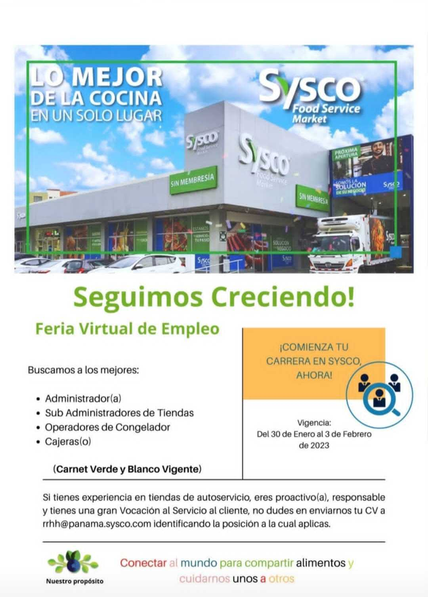 La empresa líder en ventas y distribución de alimentos Sysco Panamá, actualmente mantiene a disposición, una feria de empleo virtual desde el 30 de enero hasta el 3 de febrero, donde todos los interesados pueden enviar sus hojas de vida al siguiente correo electónico: [email protected], identificando la posición a la que desea aplicar.