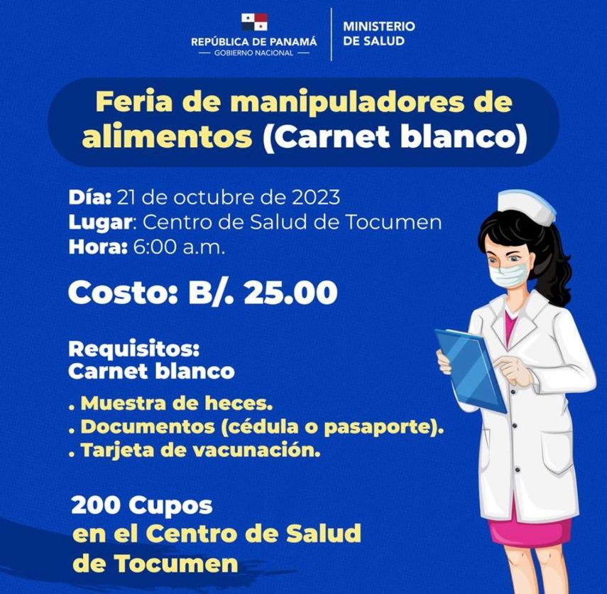 Este sábado 21 de octubre, el Ministerio de Salud (Minsa) llevará a cabo una Feria de Manipuladores de Alimentos en el Centro de Salud de Tocumen a partir de 6:00 a.m. En esta feria, se dispondrán de aproximadamente de 200 cupos disponibles, para obtener el carnet blanco que tendrá el valor de $25.