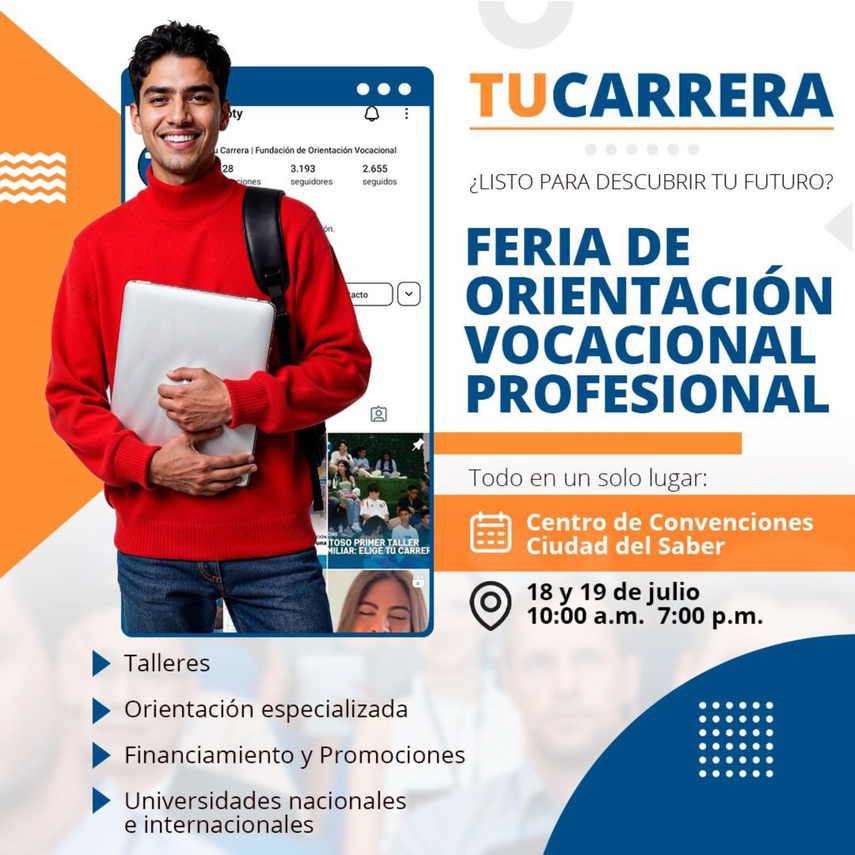 La Fundación Tu Carrera organiza la primera Feria de Orientación Vocacional Profesional en Panamá, los días 18 y 19 de julio de 2025, en el Centro de Convenciones de Ciudad del Saber, en horario de 10:00 a.m. a 7:00 p.m. La entrada es gratuita y está dirigida principalmente a jóvenes que están por elegir una carrera universitaria o técnica.