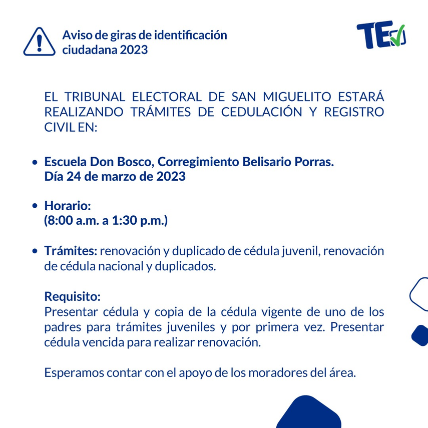El TE informa que la gira de identificación ciudadana que realizará este sábado 25 de marzo en el corregimiento de Ancón será en la Escuela de Kuna Nega, iniciará desde las 8:00 a.m. hasta las 1:30 p.m.