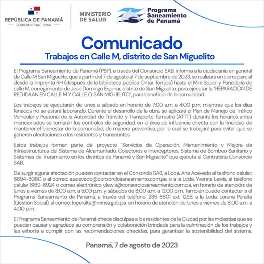 El Programa Saneamiento de Panamá (PSP), informa que a partir del 7 de agosto al 7 de septiembre de 2023, se realizará un cierre parcial desde la imprenta RH (después de la biblioteca pública Omar Torrijos) hasta el Mini Súper y Panadería de Calle M, en el corregimiento de Domingo Espinar, distrito de San Miguelito para ejecutar la "Reparación de Red IDAAN en Calle M Y Calle O, San Miguelito".
