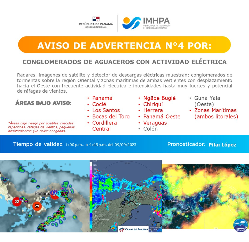 El Instituto de Meteorología e Hidrología de Panamá (IMHPA), emitió un aviso de advertencia por conglomerados de aguaceros con actividad eléctrica, para las áreas de Panamá, Coclé, Herrera, Los Santo, Bocas del Toro, Cordillera Central, Ngäbe Buglé, Chiriquí, Panamá Oeste, Veraguas, Colón, Guna Yala y zonas marítimas.