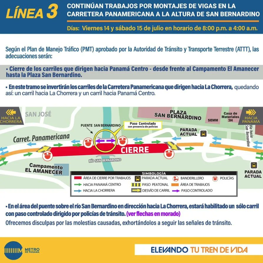 En la Carretera Panamericana a la altura de San Bernardino, en la provincia de Panamá Oeste, realizarán el cierre de dos carriles a partir de este viernes 14 y finaliza el próximo sábado 15 de julio, en un horario de 8:00 p.m. a 4:00 a.m.
