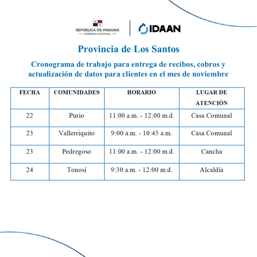 El Instituto de Acueductos y Alcantarillados Nacionales (IDAAN) ha publicado el calendario de actualización de datos, entrega de recibos y cobros para el mes de noviembre de 2023, dirigido a los clientes de la provincia de Los Santos. A continuación, se detallan las fechas y horarios de atención en la Casa Comunal de la provincia: