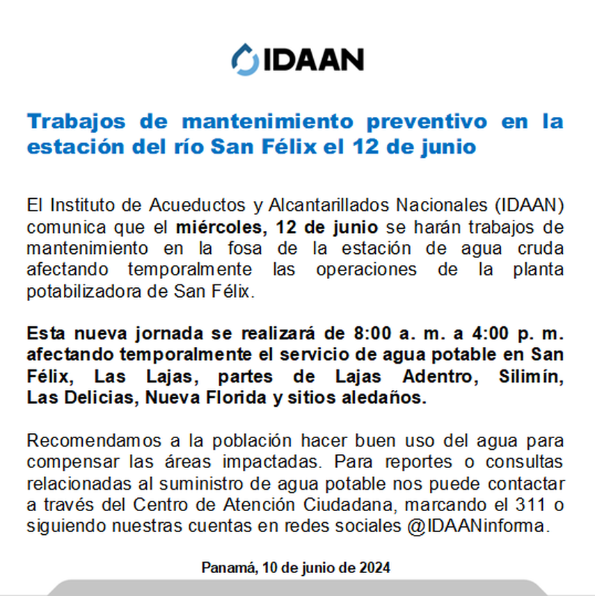Asimismo, el IDAAN ha informado que el miércoles, 12 de junio, de 8:00 a.m. a 4:00 p.m., se realizarán trabajos de mantenimiento en la fosa de la estación de agua cruda, lo que afectará temporalmente las operaciones de la planta potabilizadora de San Félix. Las áreas afectadas por este corte incluirán San Félix, Las Lajas, partes de Lajas Adentro, Silimín, Las Delicias, Nueva Florida y comunidades cercanas.