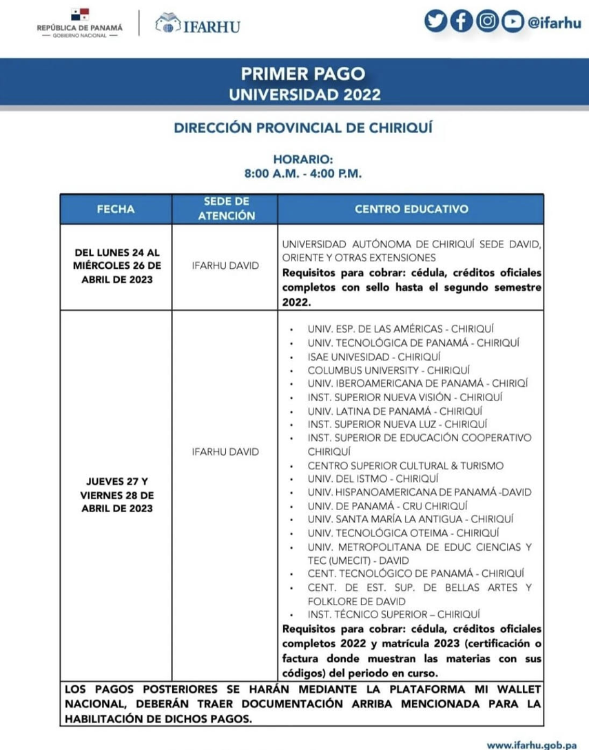 El pago de becas a estudiantes universitarios pendientes de 2022 por el Instituto para la Formación y Aprovechamiento de Recursos Humanos (IFARHU) se hará efectivo a partir del jueves 20 al 28 de abril de 2023, en la provincia de Chiriquí.