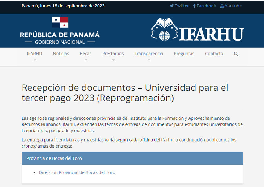 Los estudiantes que deseen conocer los horarios y los días en que las Direcciones regionales estarán recibiendo los documentos, podrán ingresar a la página del IFARHU con el fin de conocer los días hábiles.