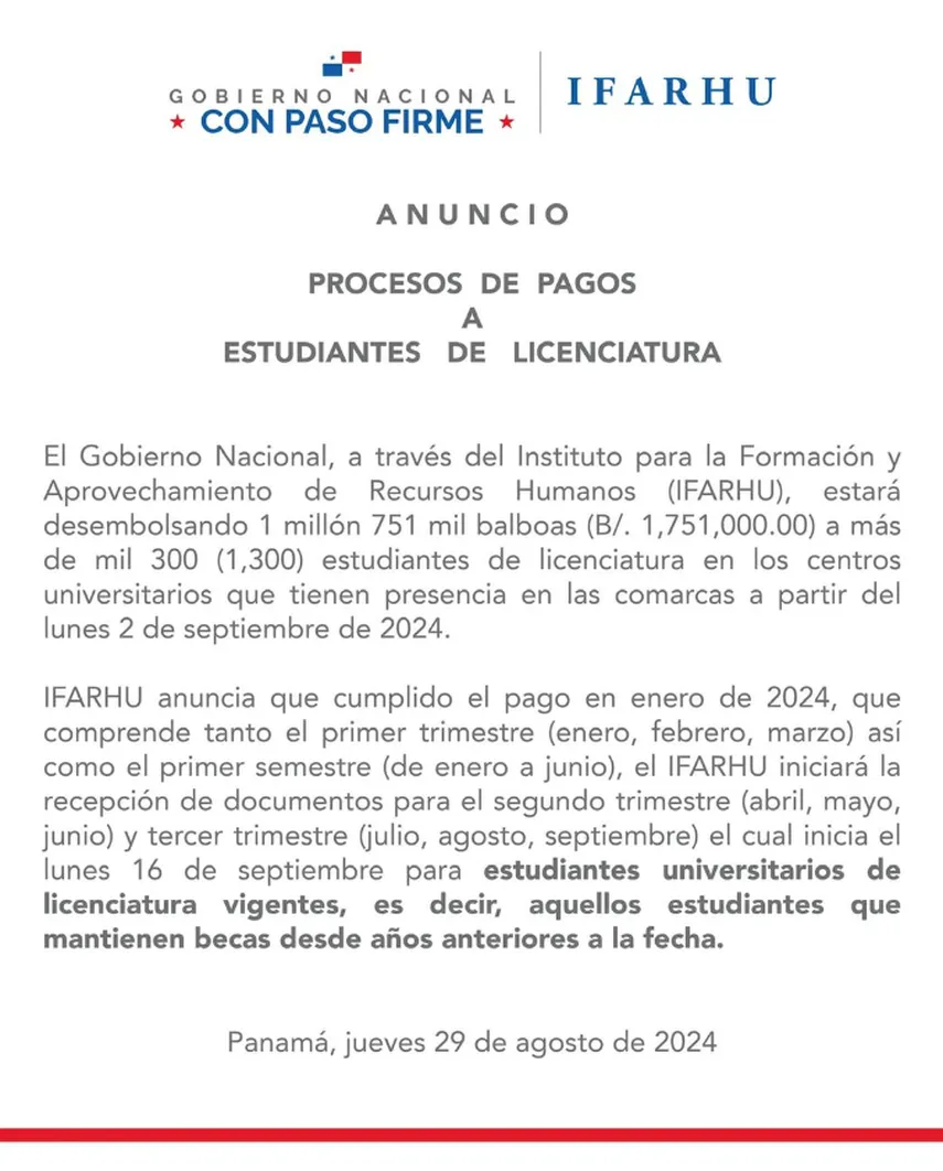 El Instituto para la Formación y Aprovechamiento de los Recursos Humanos (IFARHU) iniciará este lunes 16 de septiembre el proceso de recepción de documentación para los universitarios con becas de licenciatura vigentes, es decir, aquellos estudiantes que mantienen becas desde años anteriores.
