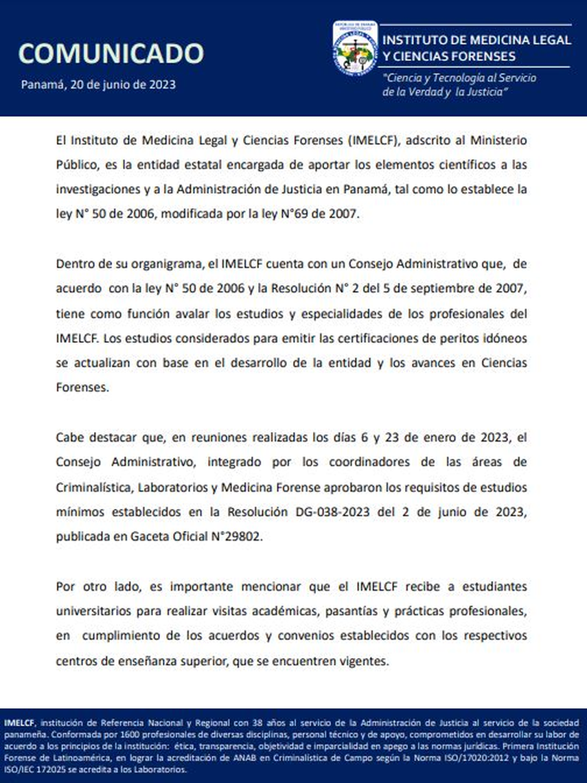 Sin embargo, el IMELCF, puntualizó que "en reuniones realizadas los días 6 y 23 de enero de 2023, el Consejo Administrativo, integrado por los coordinadores de las áreas de Criminalística, Laboratorios y Medicina Forense, aprobaron los requisitos de estudios mínimos establecidos en la Resolución DG-038-2023 del 2 de junio de 2023, publicada en Gaceta Oficial N°29802".