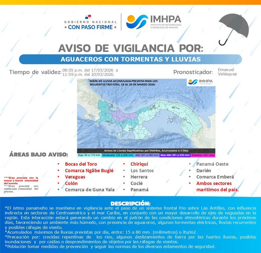 El Instituto de Meteorología e Hidrología de Panamá (IMHPA) emitió un aviso de vigilancia por aguaceros con tormentas eléctricas en varias regiones del país, vigente hasta el próximo 20 de marzo.