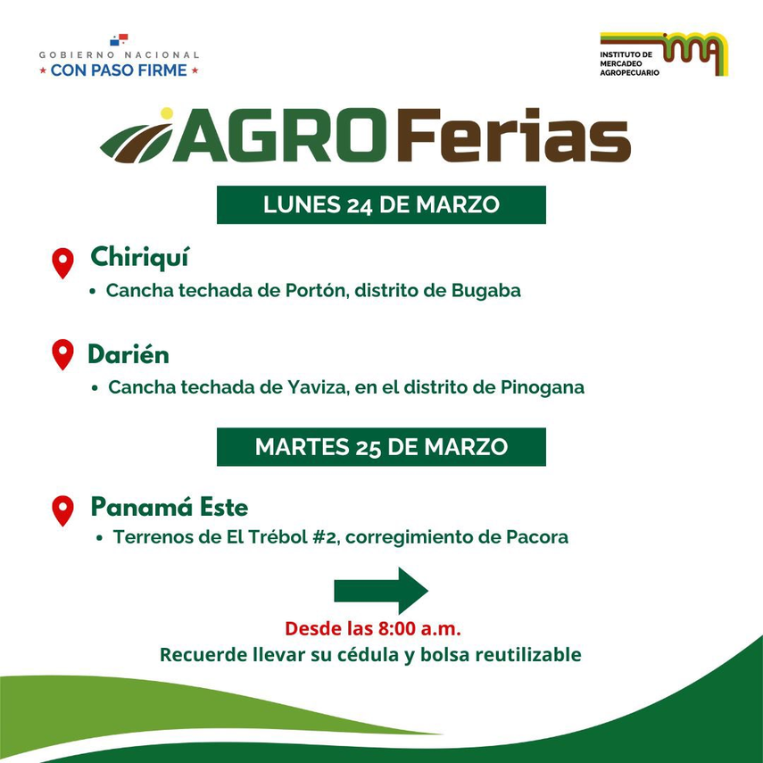 El Instituto de Mercadeo Agropecuario (IMA) invita a la ciudadanía a participar en las Agroferias que se realizarán este lunes 24 de marzo, comenzando a las 8:00 a.m., donde se ofrecerán productos frescos a precios accesibles. Recuerda llevar tu bolsa reutilizable para facilitar la compra.