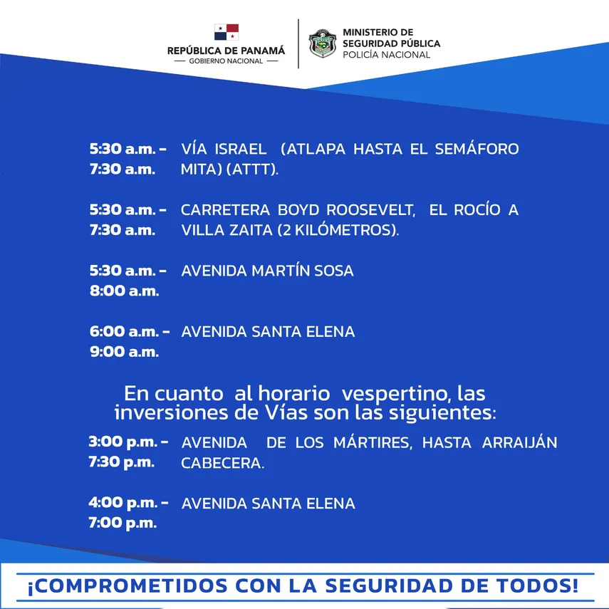 - 5:30 a.m. a 7:30 a.m. en la Vía Israel, de Atlapa hasta el semáforo Mita en la ATTT.