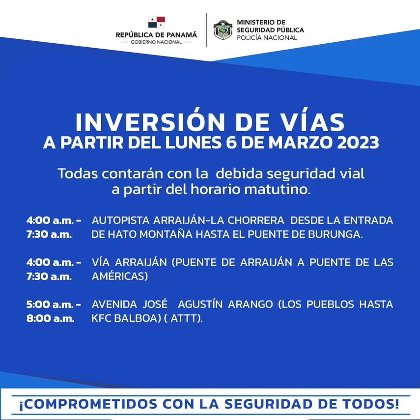 Este lunes 6 de marzo comienza el año escolar 2023 y la inversión de carriles será desde las 4:00 a.m. en distintos puntos de la ciudad capital y en la provincia de Panamá Oeste. Esto debido a la gran cantidad de ciudadanos que se encontrarán en las vías trasladándose a los centros educativos.