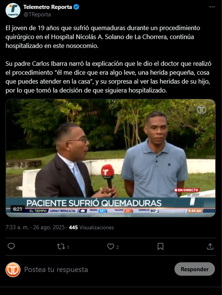 Un joven de 19 años continúa hospitalizado tras sufrir quemaduras durante un procedimiento quirúrgico en el Hospital Nicolás A. Solano de La Chorrera.