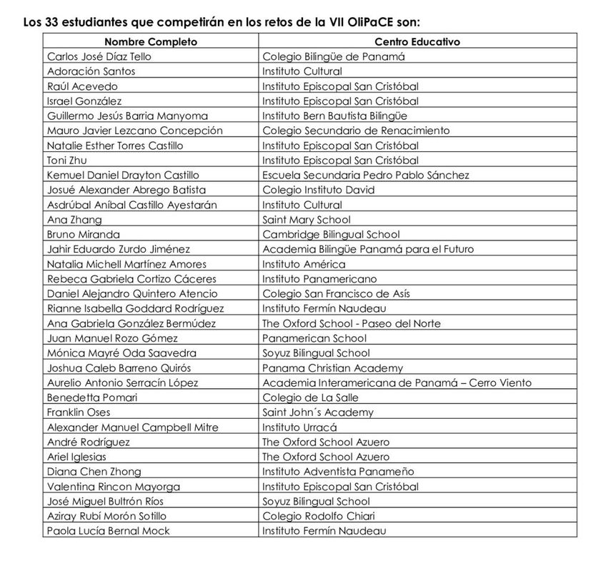 Desde este jueves y hasta el sábado 15 de junio, se llevará a cabo la fase de retos de la VII Olimpiada Panameña de Ciencias Espaciales (OliPaCE), organizada por la Secretaría Nacional de Ciencia, Tecnología e Innovación (Senacyt) en conjunto con la Ciudad del Saber.