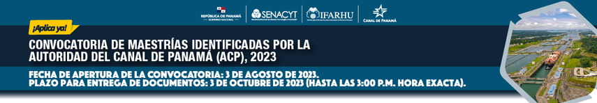 La Secretaría Nacional de Ciencia, Tecnología e Innovación (SENACYT) mantiene una convocatoria de becas de maestrías identificadas por la Autoridad del Canal de Panamá (ACP) para personas de nacionalidad panameña, con grado de licenciatura o equivalente, interesados en realizar estudios de maestría en las áreas y centro de excelencia establecidas en el listado a continuación: https://www.senacyt.gob.pa/wp-content/uploads