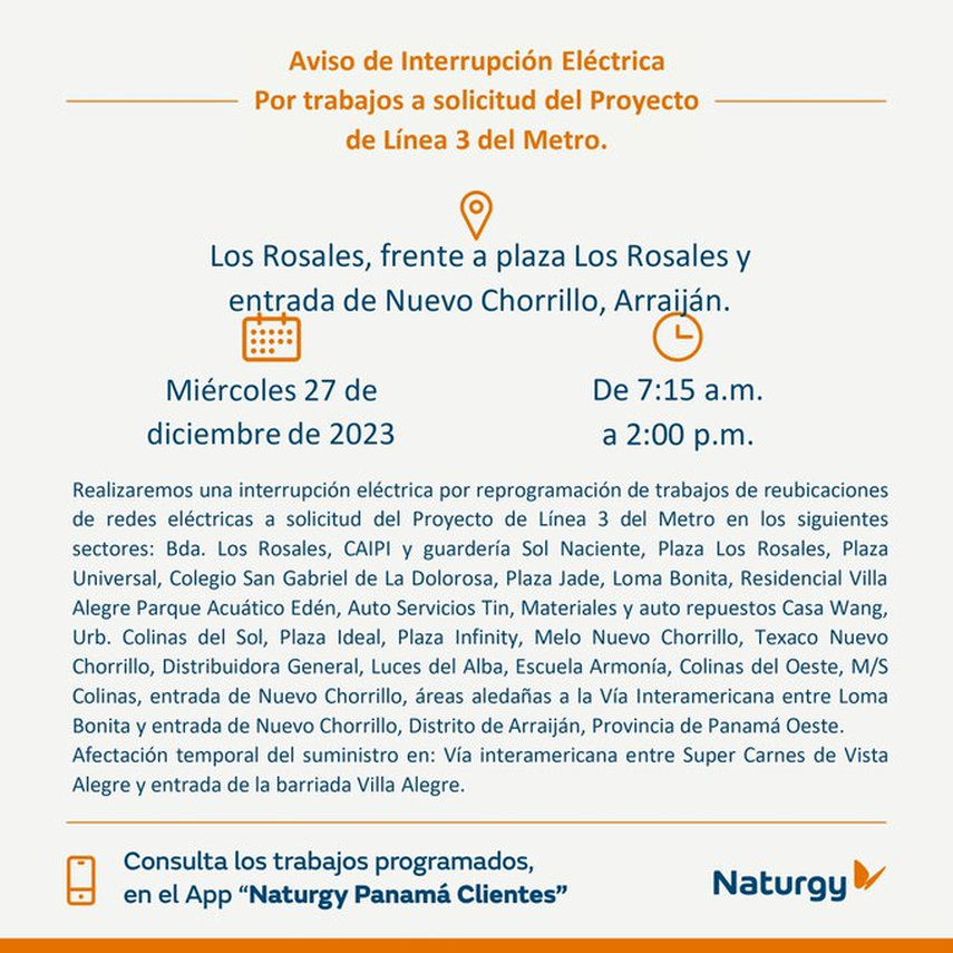 La compañía distribuidora de energía eléctrica Naturgy realizará una interrupción por reprogramación de trabajos de reubicaciones de redes eléctricas a solicitud del Proyecto de Línea 3 del Metro en los siguiente sectores del distrito de Arraiján, provincia de Panamá Oeste: