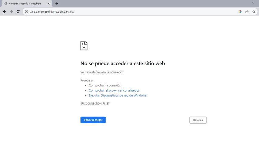 Paralelamente, al intentar verificar el monto el la sección Vale Digital de Panamá Solidario, la página aparece inhabilitada.