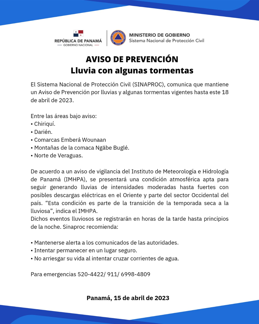 El Sistema Nacional de Protección Civil (SINAPROC), emitió un aviso de prevención por lluvias y algunas tormentas vigentes hasta el martes 18 de abril de 2023. El estamento informa que, las provincias bajo aviso son: Chiriquí, Darién; las comarcas Emberá Wounaan y montañas de la comarca Ngäbe Buglé; además del norte de Veraguas.