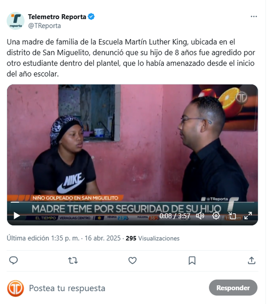 Por su parte, la Dirección Regional del Ministerio de Educación (MEDUCA) informó que continúa impulsando proyectos de prevención y promoción de la sana convivencia dentro de los centros escolares, con el objetivo de reducir los casos de violencia entre estudiantes.