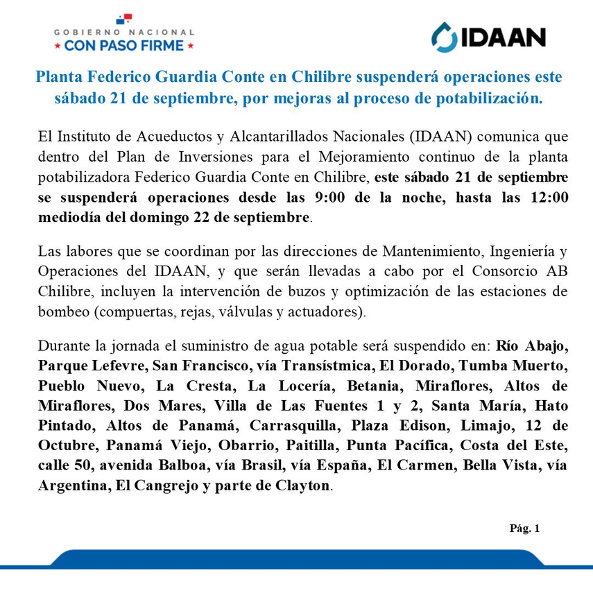 Desde este sábado 21, a partir de las 9:00 p.m., hasta las 12:00 mediodía del domingo 22 de septiembre, la planta potabilizadora de Chilibre "Federico Conte Guardia" suspenderá sus operaciones debido a trabajos de mantenimiento en sus instalaciones. Este será el primero de cinco trabajos programados con el objetivo de mejorar sus operaciones.
