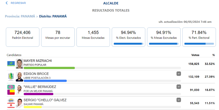Con el escrutinio de una gran parte de los votos en curso, los primeros resultados de la Alcaldía de Panamá están comenzando a tomar forma, brindando una perspectiva inicial del panorama político local. Según los datos preliminares, Mayer Mizrachi, candidato por el partido Popular, ha emergido como líder destacado con el 70% de los votos escrutados.