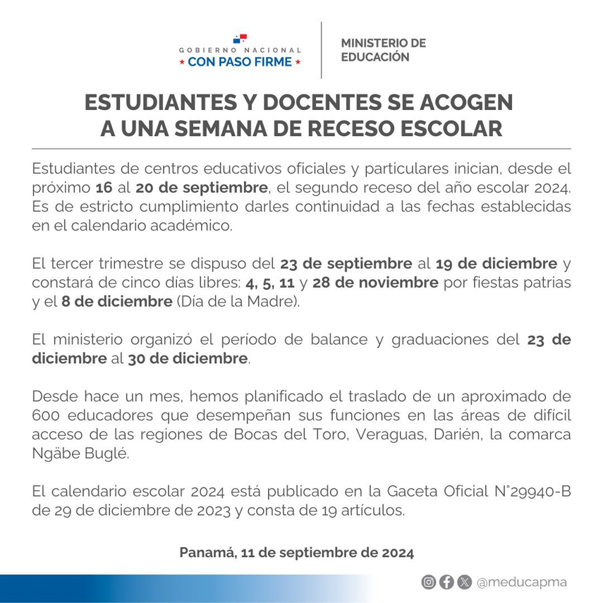 El Ministerio de Educación (MEDUCA) ha comunicado que los estudiantes de centros educativos oficiales y particulares tendrán un segundo receso del año escolar 2024, que se llevará a cabo del 16 al 20 de septiembre. Esta pausa en el calendario escolar debe ser cumplida estrictamente, de acuerdo con las fechas establecidas en el calendario académico.