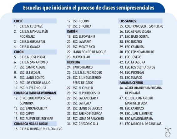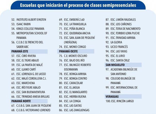 En la lista publicada por Meduca figuran 4 escuelas de la región de Coclé, 7 escuelas de la región de Colón, 4 escuelas de la Comarca Emberá, 3 escuelas de la Comarca Ngäbe-Buglé, 5 escuelas de la región de Darién, 11 escuelas en la región de Herrera, 11 escuelas de la región de Los Santos, 11 escuelas de Panamá Centro, 10 escuelas de Panamá Este, 8 escuelas de Panamá Norte, 22 en Panamá Oeste, 3 en San Miguelito y 1 en Veraguas.