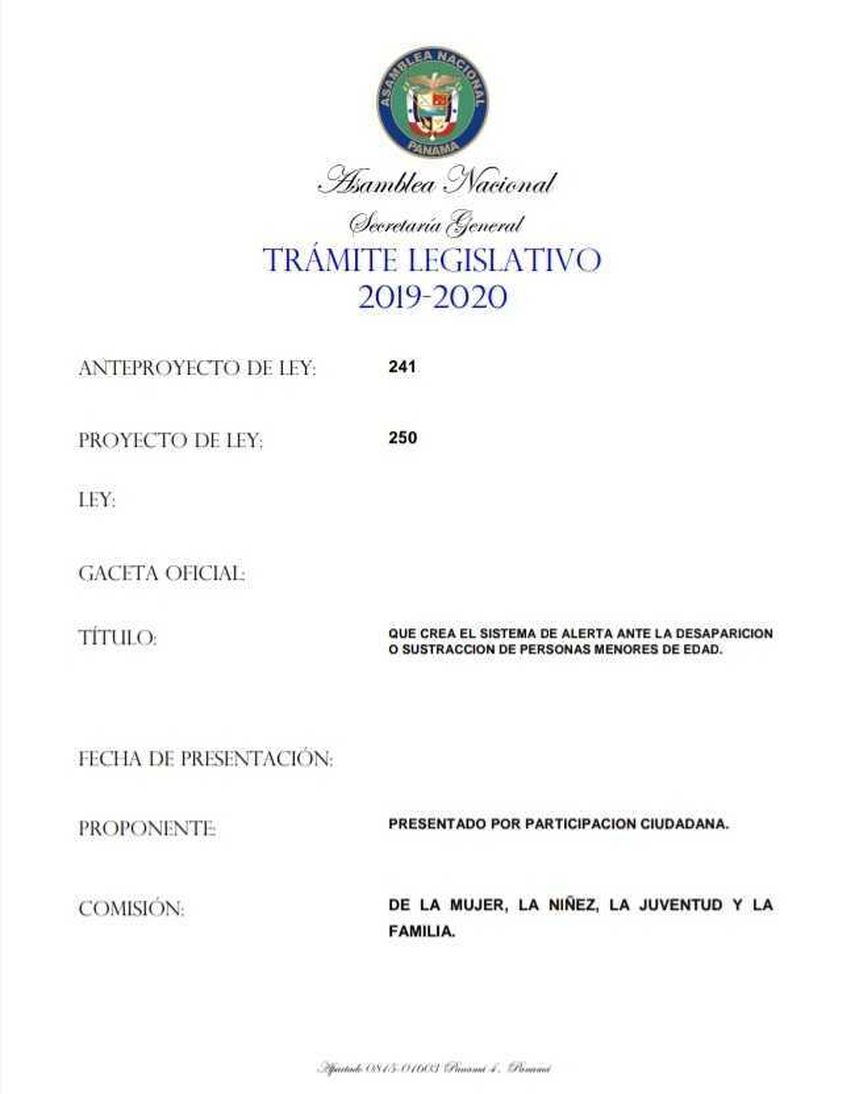 En el año 2019, la Asamblea Nacional buscaba la creación de la Alerta AMBER en Panamá, con el anteproyecto No. 250, por parte de la Comisión de la Mujer, la Niñez, la Juventud y la Familia. Más tarde, en septiembre del 2020, es aprobada por los diputados, y sancionada por el presidente Laurentino Cortizo, el 24 de junio del 2021, bajo la ley No.230 "que crea el Sistema de Alerta AMBER para la ubicación rápida y expedita ante la desaparición y sustracción de personas mayores de edad".