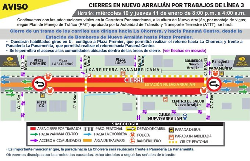 El Metro de Panamá informa a conductores y residentes sobre el cierre temporal de la carretera Panamericana a la altura de Nuevo Arraiján, el miércoles 10 y jueves 11 de enero en horario de 8:00 p.m. a 4:00 a.m., por trabajos de montaje de vigas de la Línea 3.