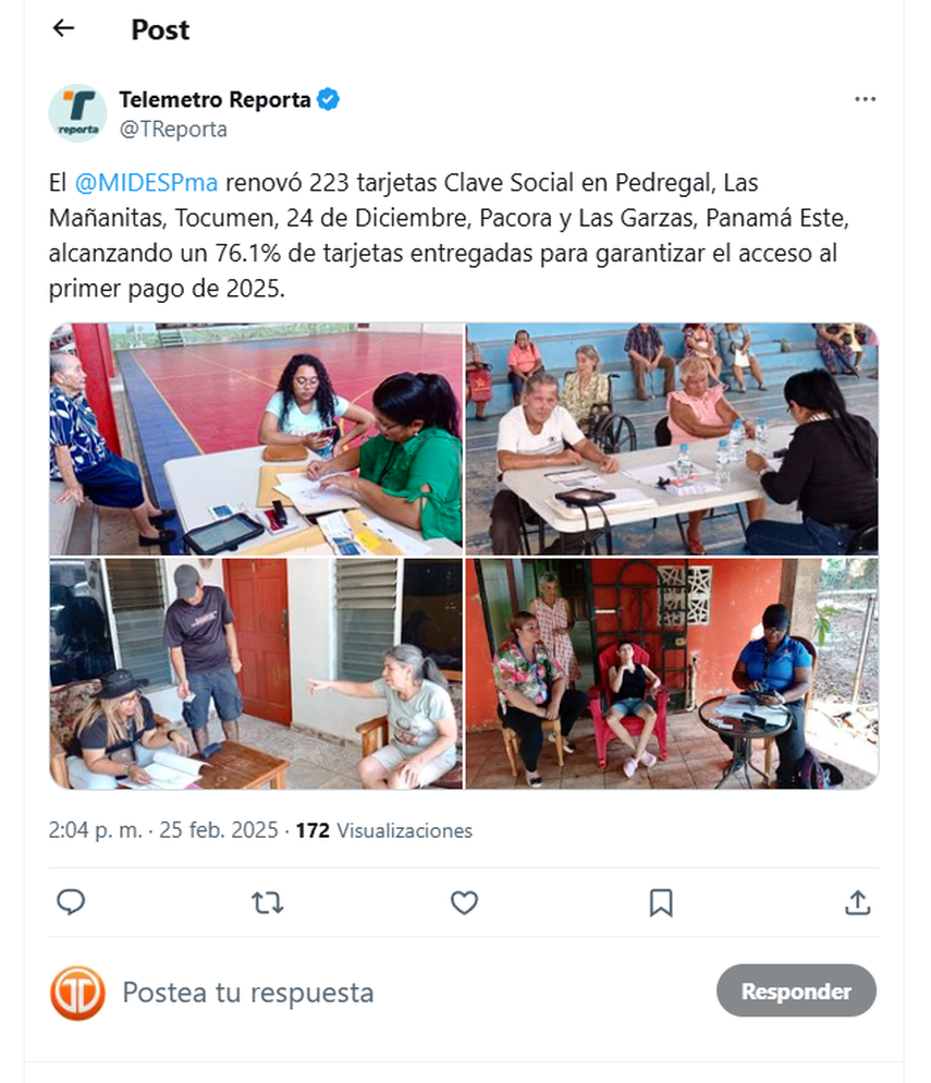 El Ministerio de Desarrollo Social (MIDES) ha renovado un total de 223 tarjetas Clave Social en sectores de Pedregal, Las Mañanitas, Tocumen, 24 de Diciembre, Pacora y Las Garzas, en la provincia de Panamá Este, alcanzando un 76.1% de las tarjetas entregadas para garantizar el acceso al primer pago de 2025.