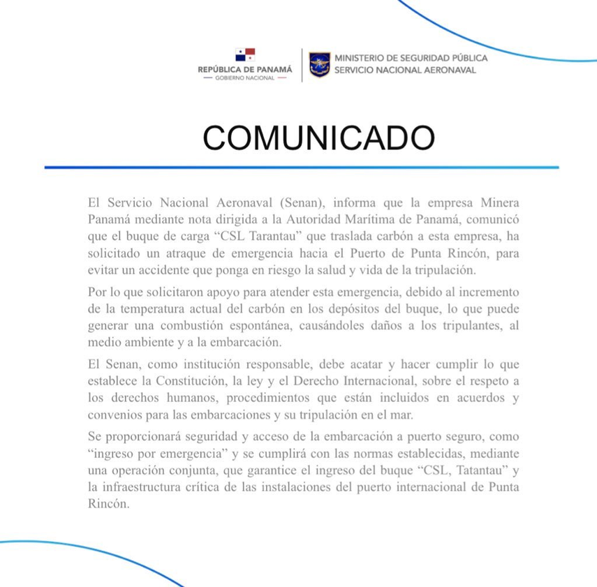 El Senan afirmó que como institución responsable que debe acatar y cumplir la ley, proporcionará seguridad y acceso a la embarcación a puerto seguro, como “Ingreso por emergencia” mediante una operación conjunta, que garantice el ingreso del buque “CSL, Tatantau” y la infraestructura crítica de las instalaciones del puerto internacional de Punta Rincón.