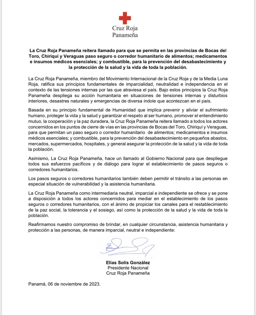 La Cruz Roja de Panamá ha reiterado su llamado a los manifestantes que mantienen las vías bloqueadas en Bocas del Toro, Chiriquí y Veraguas, en medida de rechazo a la Ley 406, instándolos a permitir el paso seguro o la creación de corredores humanitarios para garantizar el suministro de alimentos, medicamentos, insumos médicos esenciales y combustibles en estas áreas que enfrentan desabastecimiento.