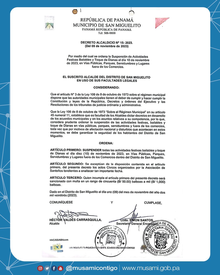 El Municipio de San Miguelito ordenó suspender las actividades festivas del 10 de noviembre en vías públicas, parques y otros sitios, con excepción de los actos cívicos de la Asociación de Santeños. Advierte multas de hasta 1,000 dólares a quienes incumplan esta disposición.