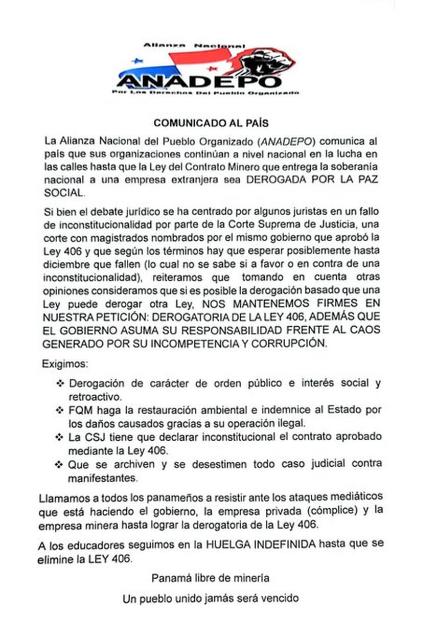 Anadepo comunica que "sus organizaciones continúan a nivel nacional con la lucha en las calles" hasta que la ley de contrato minero sea derogada."Exigimos al Ejecutivo derogación de carácter de orden público, de interés social y retroactivo", enfatizaron.Vídeo: @RochexRB27… pic.twitter.com/mDbiTcqZe6