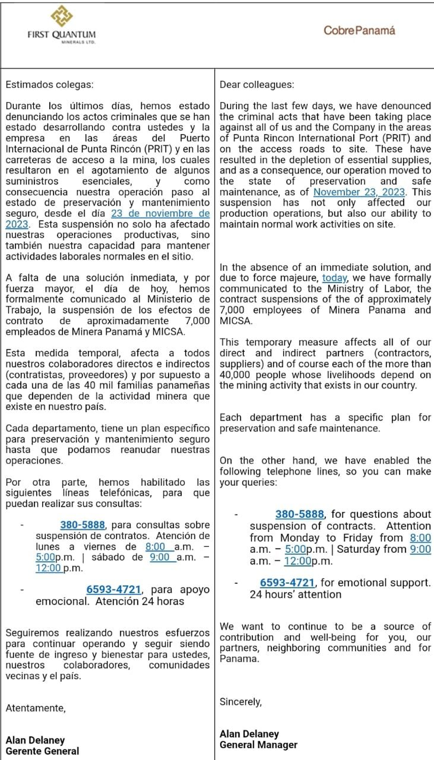 Mediante un comunicado, la empresa encargada de Minera Panamá, First Quantum Ltd, comunicó formalmente al Ministerio de Trabajo y Desarrollo Laboral (MITRADEL) la suspensión de 7,000 empleados. Según explican la decisión se da "a falta de una solución inmediata, y por fuerza mayor".