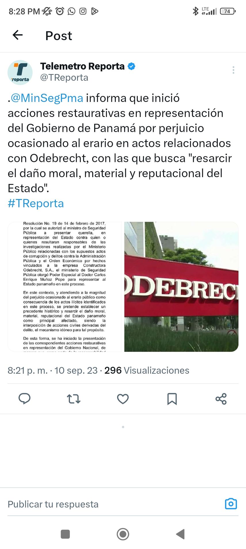 El Ministerio de Seguridad Pública ha sido autorizado a presentar querella, en representación del Estado contra quien o quienes resultaran responsables de las investigaciones realizadas por el Ministerio Público, relacionadas con los supuestos actos de corrupción y delitos contra la Administración Pública y el Orden Económico por hechos vinculados a la empresa Constructora Odebrecht, S.A.