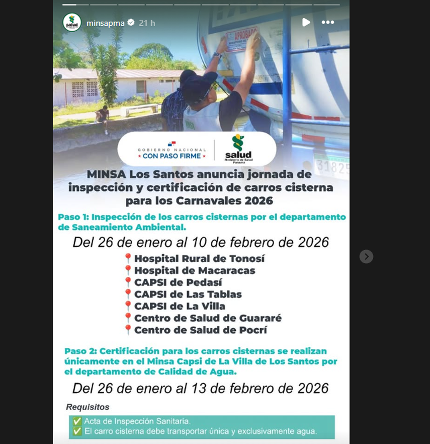 El Ministerio de Salud (MINSA), a través de la Región de Salud de Los Santos, anunció la jornada de inspección y certificación de carros cisterna que serán utilizados durante los Carnavales 2026, con el objetivo de garantizar el uso seguro del agua y el cumplimiento de las normas sanitarias vigentes.