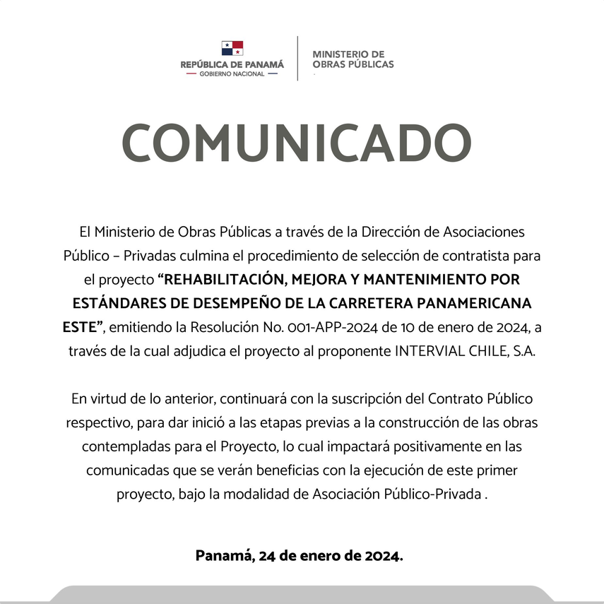 El Ministerio de Obras Públicas (MOP) ha finalizado el proceso de selección de contratista para el proyecto "Rehabilitación, Mejora y Mantenimiento por Estándares de Desempeño de la Carretera Panamericana Este". La Resolución No. 001-APP-2024, emitida el 10 de enero de 2024, adjudica el proyecto a la empresa INTERVIAL CHILE, S.A.