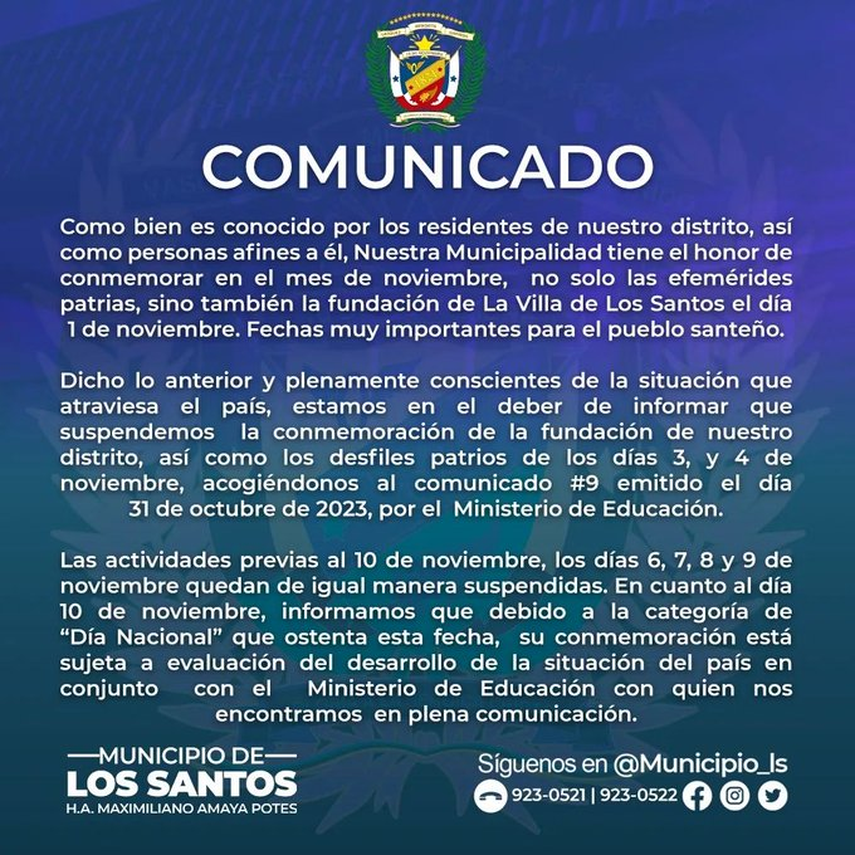 El Municipio de Los Santos, a través de un comunicado oficial, informa a la ciudadanía que debido a la situación del país, que ha generado cierres y protestas en contra de la Ley 406, se suspenden las festividades de la fundación de La Villa de Los Santos programadas para el 1 de noviembre, así como las actividades previstas para los días 6, 7, 8 y 9 de noviembre.