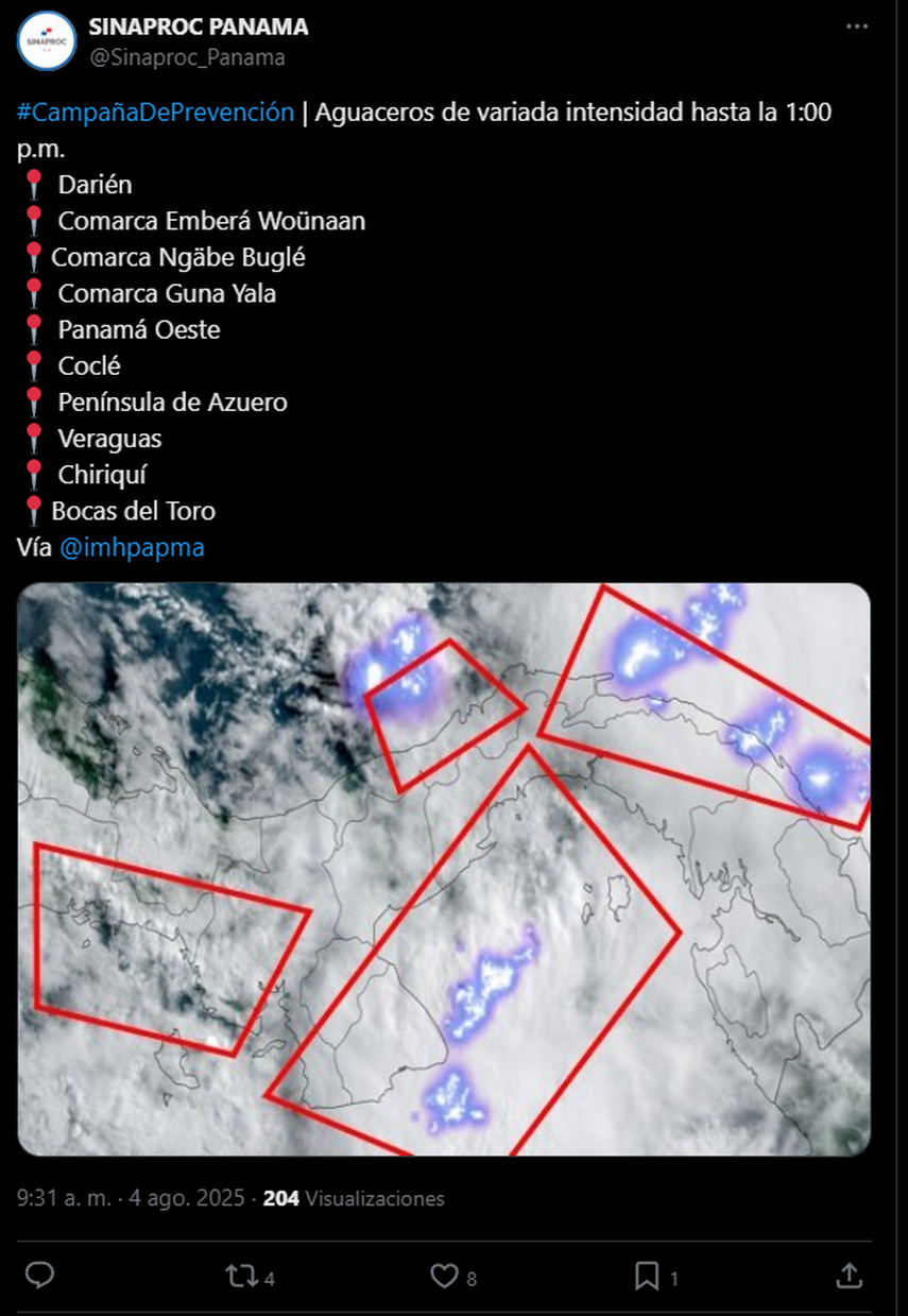 El Sistema Nacional de Protección Civil (SINAPROC) emitió un aviso de prevención por aguaceros de variada intensidad para este lunes 4 de agosto, que afectarán varias regiones del país.