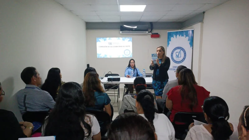 El seminario-taller fue impartido por la Mgtr. Mixela Samaniego, corresponsable de la Comisión de Accesibilidad al Voto, junto a las licenciadas Anyela Solís, psicóloga, y Yaribeth García, intérprete de lenguaje de señas.