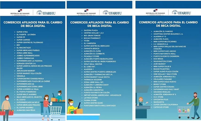Existe más de 300 comercios incluyendo supermercados, almacenes, farmacias y jumbo supermercados los padres de familia o tutores de estudiantes pueden cambiar y utilizar el pago de la Beca Digital que otorga el Instituto para la Formación y Aprovechamiento de los Recursos Humanos (IFARHU).