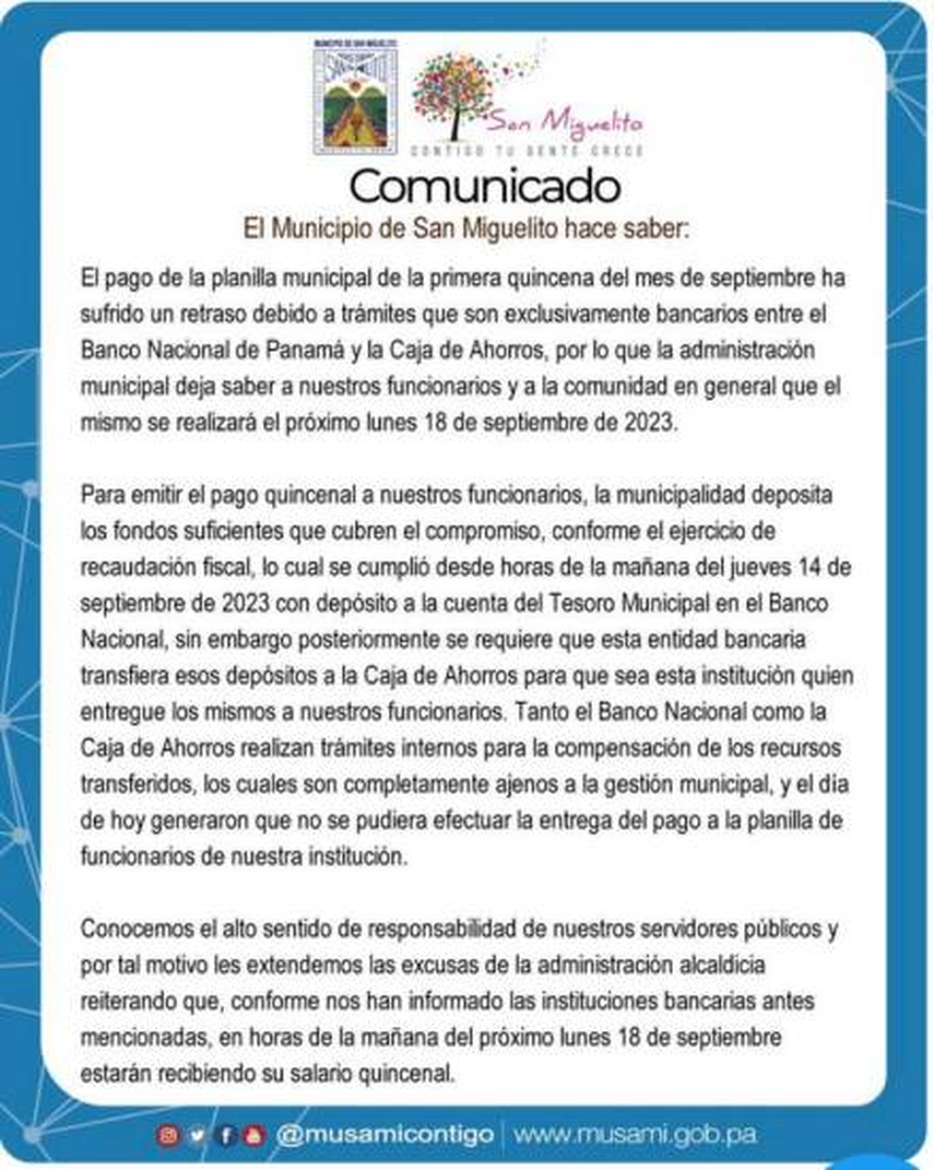 El Municipio de San Miguelito, explica mediante un comunicado que, “para emitir el pago quincenal a nuestros funcionarios, la municipalidad deposita los fondos suficientes que cubren el compromiso, conforme el ejercicio de recaudación fiscal, lo cual se cumplió desde horas de la mañana del jueves 14 de septiembre de 2023 con depósito a la cuenta del Tesoro Municipal en el Banco Nacional, sin embargo, posteriormente se requiere que esta identidad bancaria transfiera esos depósitos a la Caja de Ahorros para que sea esta institución quien entregue los mismos a nuestros funcionarios”.