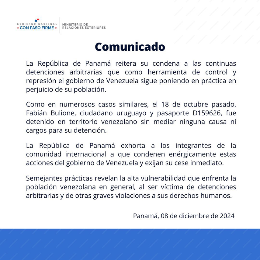 La República de Panamá reitera su condena a las continuas detenciones arbitrarias que el gobierno de Venezuela sigue llevando a cabo como herramienta de control y represión contra su población.