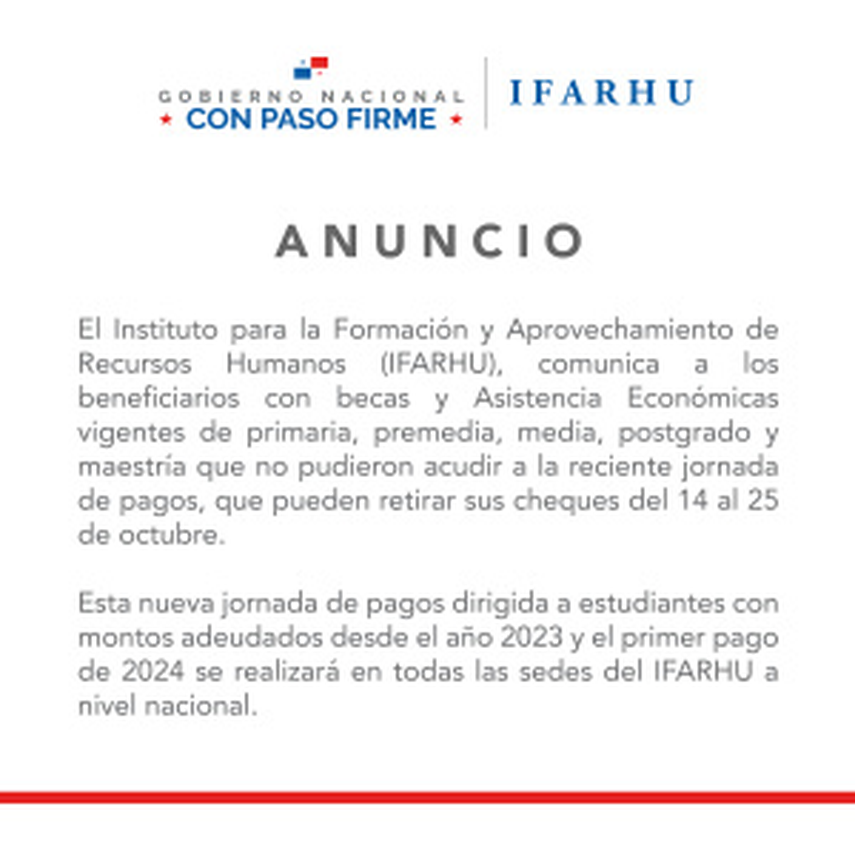El Instituto para la Formación y Aprovechamiento de Recursos Humanos (IFARHU) informó que del 14 al 25 de octubre se llevará a cabo una nueva jornada de pago para estudiantes con becas y asistencia económica. Este proceso está dirigido a beneficiarios de primaria, premedia, media, postgrado y maestría que no pudieron recibir sus pagos en la jornada anterior.