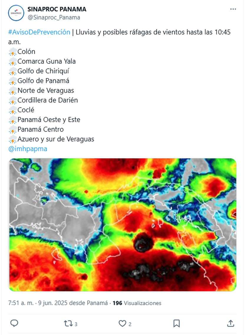 El Sistema Nacional de Protección Civil (SINAPROC), en conjunto con el Instituto de Meteorología e Hidrología de Panamá (IMHPA), emitió este jueves un aviso de prevención por lluvias acompañadas de posibles ráfagas de viento, vigente hasta el 12 de junio, debido a condiciones atmosféricas inestables.